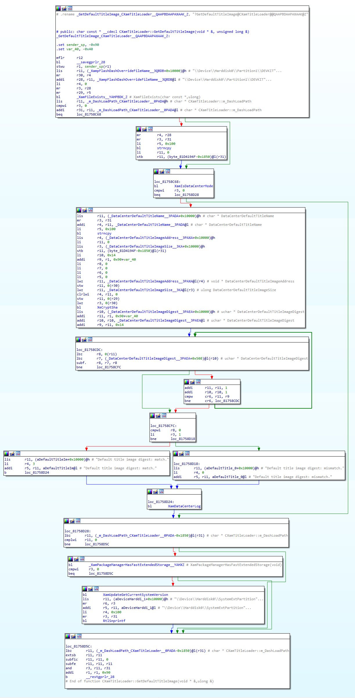 4 years later, someone at Microsoft realized they may be able to speed up the dash by moving it to one of the new hard-drive partitions. The v16197 update brought a lot of features, but one small feature no noticed was how the dash executable was moved to the hard-drive’s System Extended partition. A new function was added to the Xbox Application Manager (xam) named CXamTitleLoader::GetFastestDashLoadPath. Here’s what it looks like in IDA:
