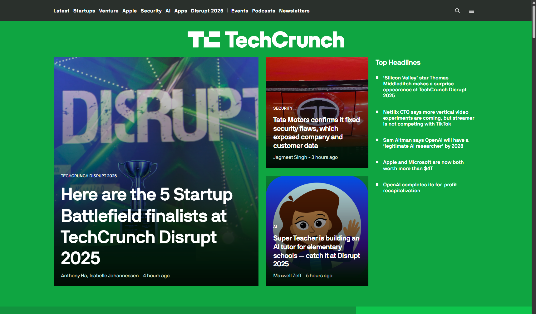 - TechCrunch (Front page screenshot – October 29, 2025)