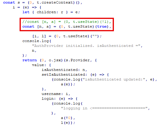Looking closely, I saw an easy potential bypass method: setting the initial “isAuthenticated” value to true. One change in the compiled JS…