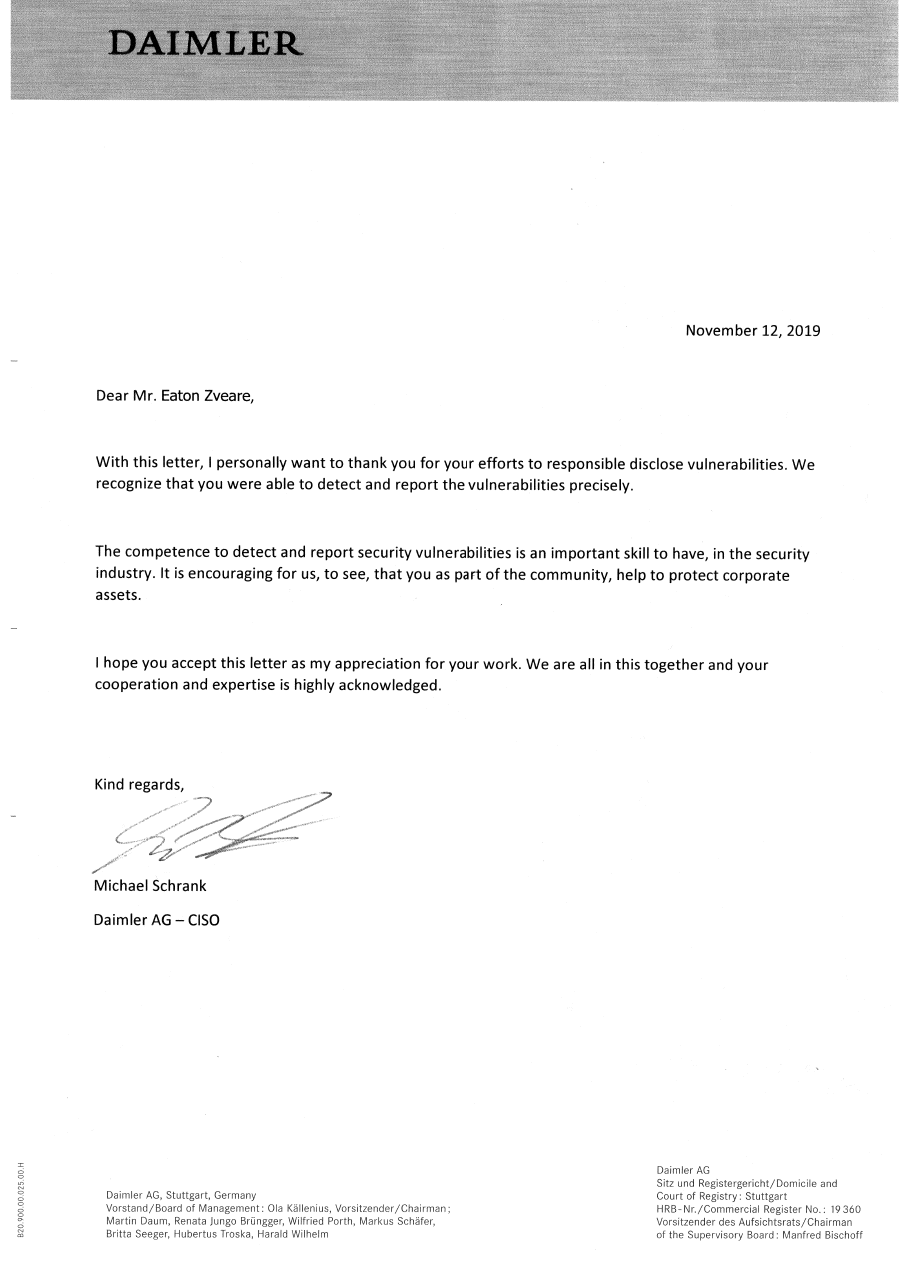 Thank-you letter from Mercedes-Benz CISO, Michael Schrank